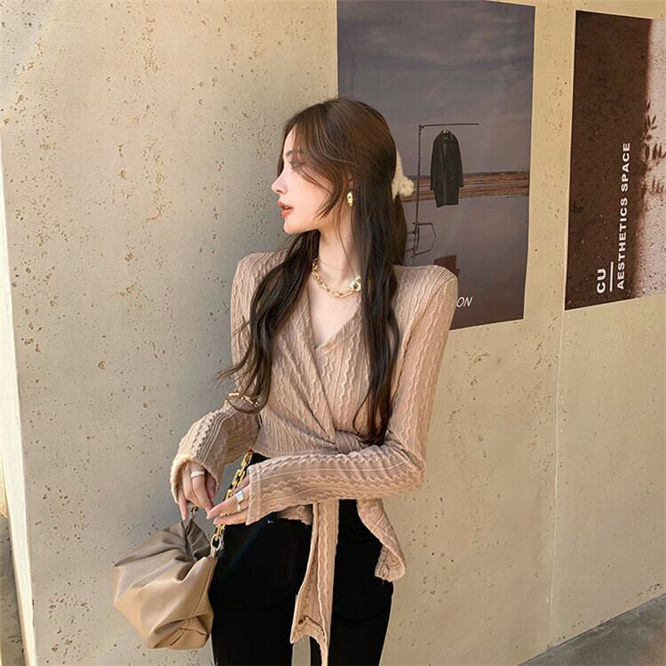 韓国ファッション 交差する フォールド バンディング Vネック 長袖 ニット 秋 冬