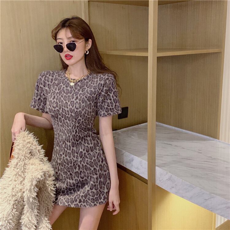 スリム レオパード柄 ワンピース 気質 百掛け 半袖 暖かい 厚手 減齢 2024年新作 秋 冬 カジュアル